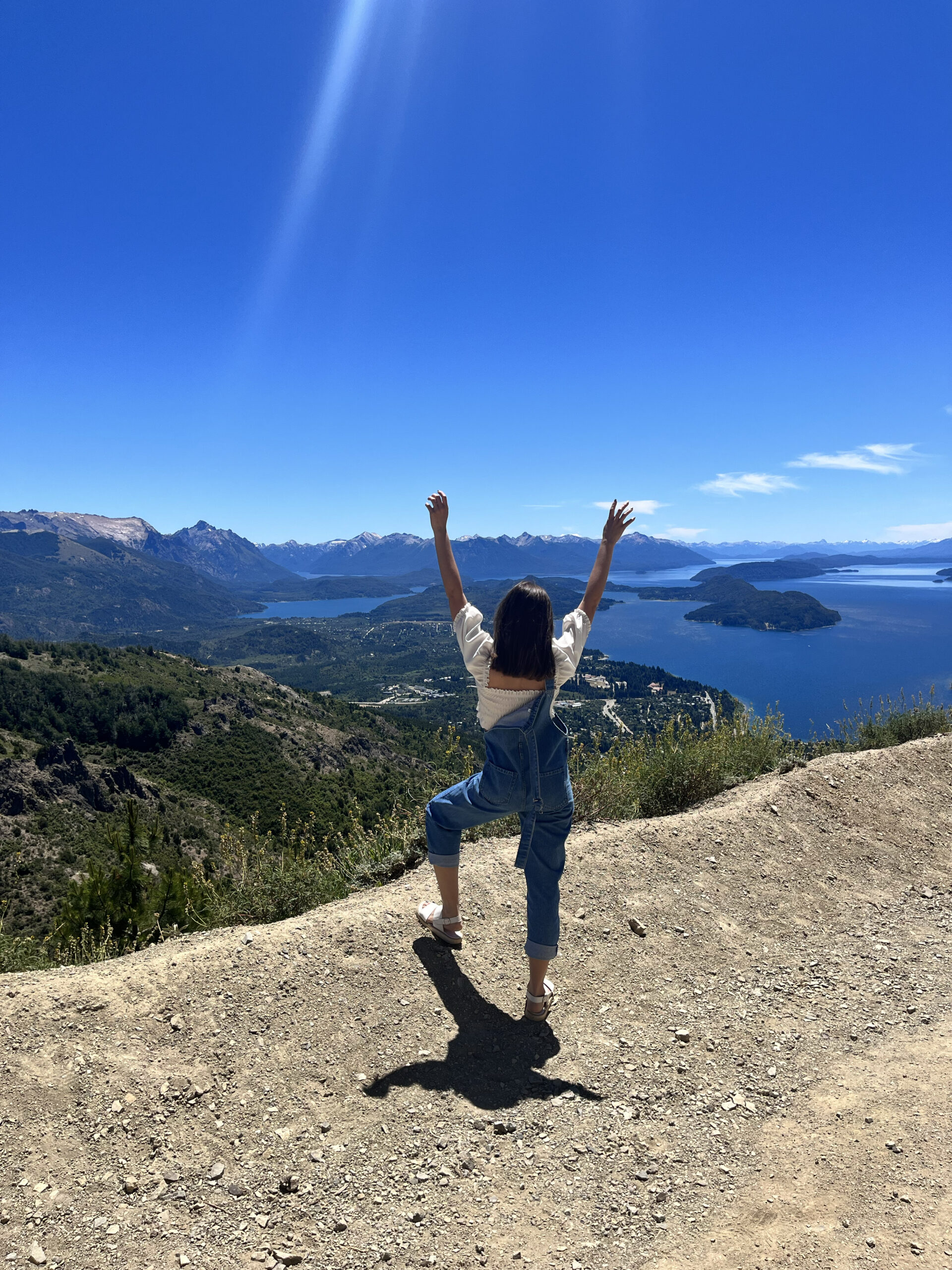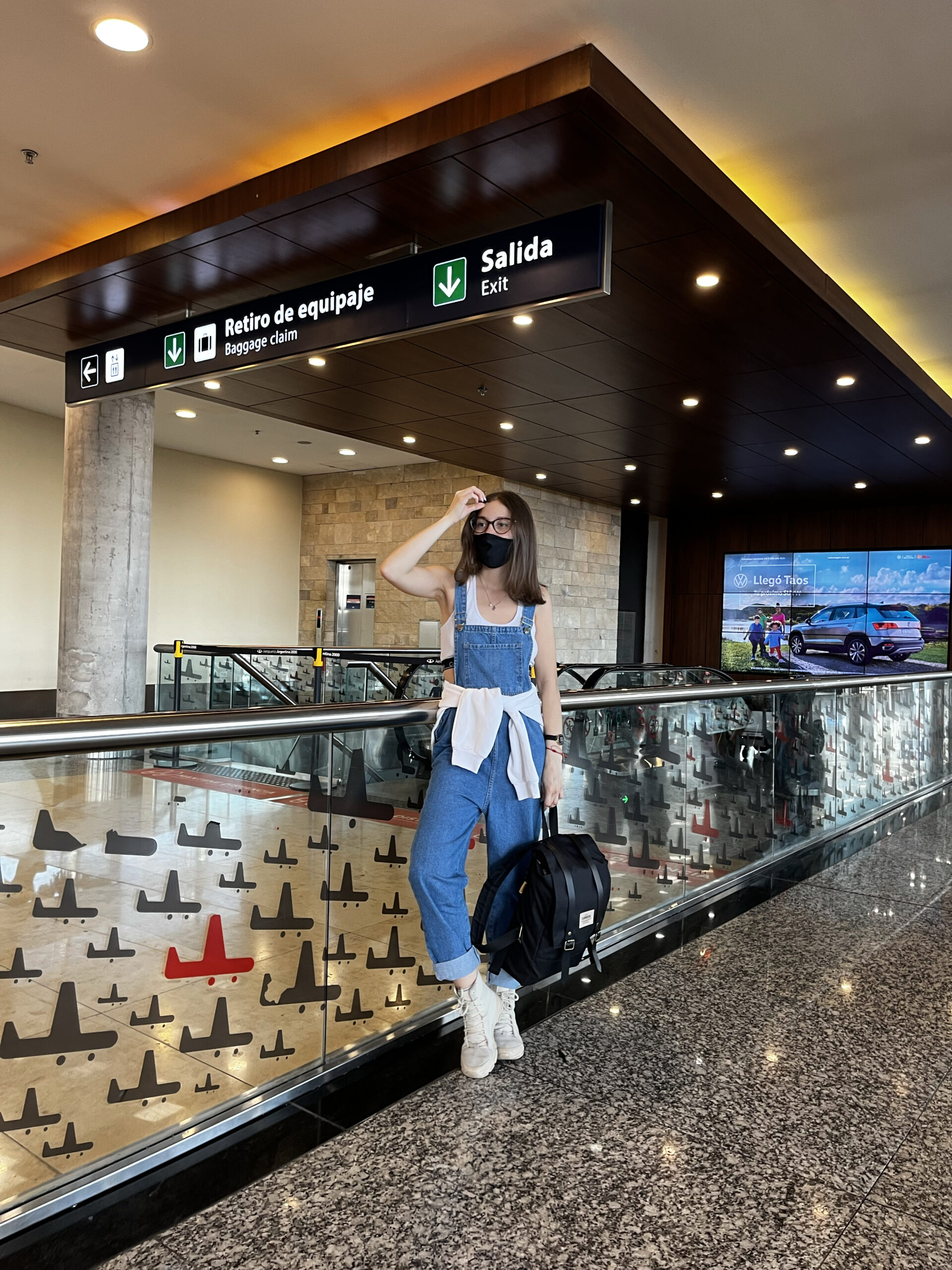 - Día 1: Este fue el día que viajamos a nuestro destino. Me llevé puesto un jardinero denim largo, combinado con top básico blanco y buzo blanco atado a la cintura. También llevaba campera a la mano, para que no me ocupara espacio en mi mochila y por el frío que probablemente haría cuando llegáramos.